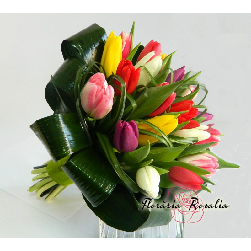 Buchet 19 lalele multicolore, verdeata , accesorii.