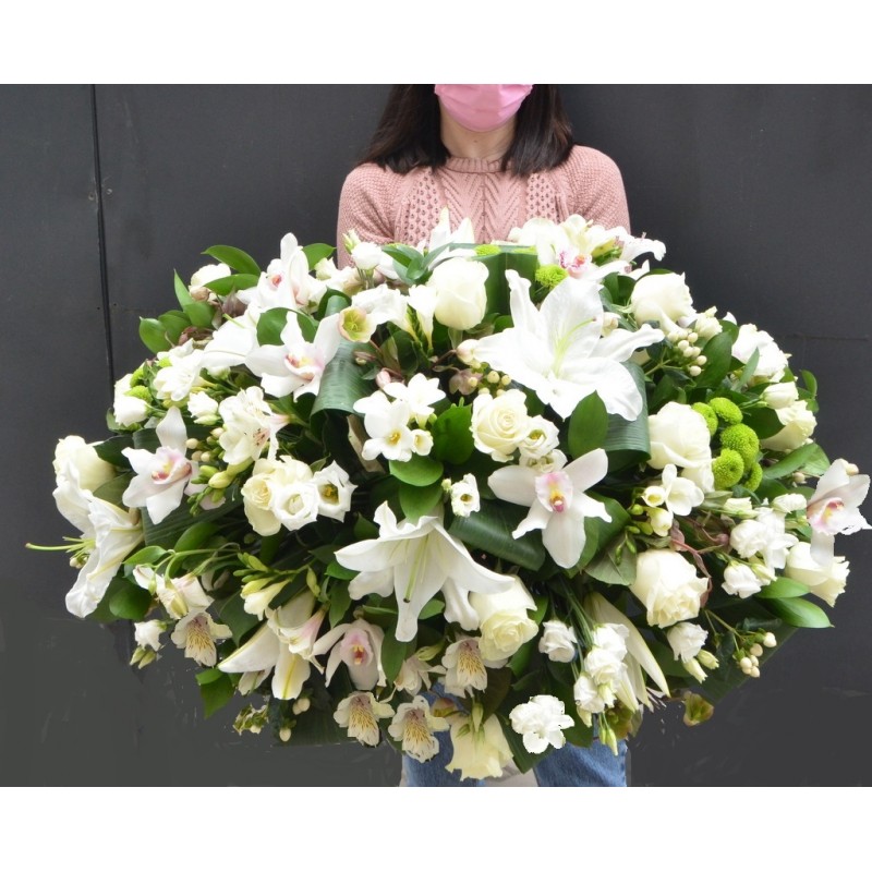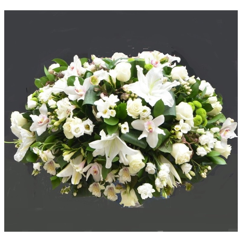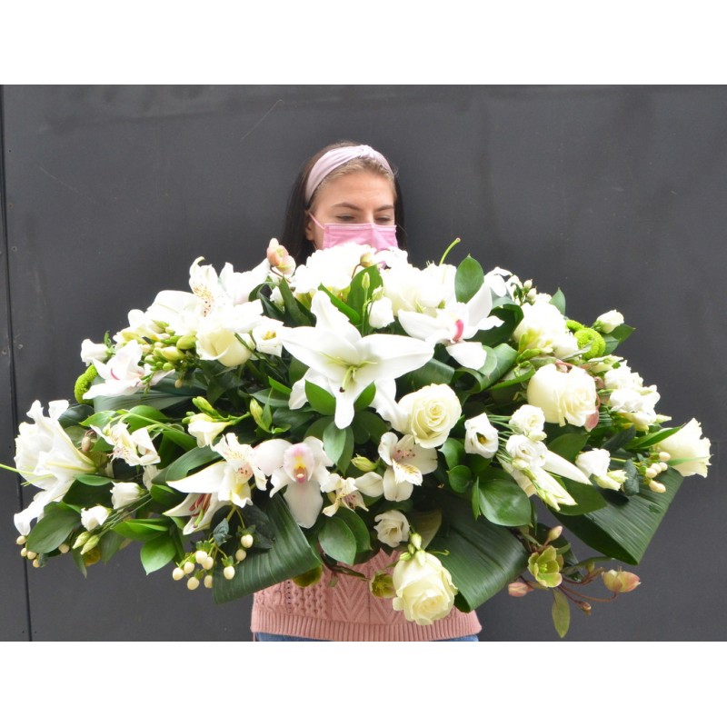 Aranjament cu trandafiri albi, crini, orhidee cybidium, frezii, eustoma, alstromeria, santini, hypericum sau gypsophila, verdeata si accesorii. Lungime cca 1 metru