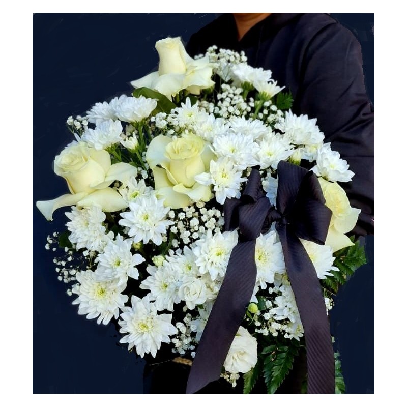 Jerba pe verticala cu 4 trandafiri albi, 6 crizanteme, gypsophila, verdeata si accesorii. Aranjamentul este lucrat in burete umed pentru a mentine florile timp indelungat.
