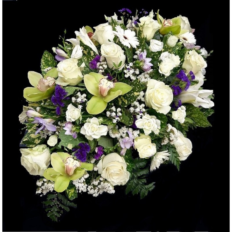 Aranjament cu trandafiri albi, crini, orhidee cybidium verzi, frezii, eustoma, miniroze minigerbere, limonium sau gypsophila, verdeata si accesorii. Lungime cca 79-80 cm