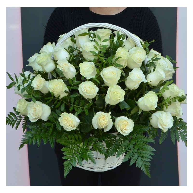 Aranjament in cos nuiele cu 50 de trandafiri albi si verdeata, fixat in burete floral pentru a conferi prospetime florilor cat mai mult timp.
