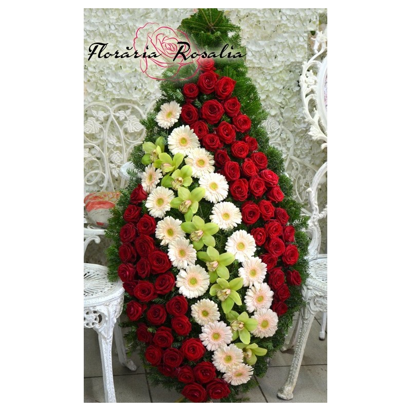 Coroana realizata pe suport de brad cu inaltimea de 140 cm, contine 50 trandafiri si 20 gerbera si 10 orhidee. Produsul poate fi realizat si in alte nunte coloristice.