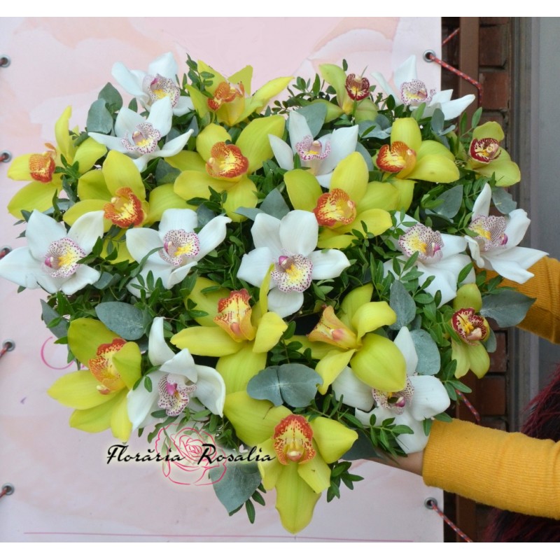 Aranjament in forma de inima realizat pe suport cu burete, diametru aprox 40-45cm  contine 24 orhidee cymbidium si verdeata. Produsul poate fi realizat si in alte nunte coloristice.