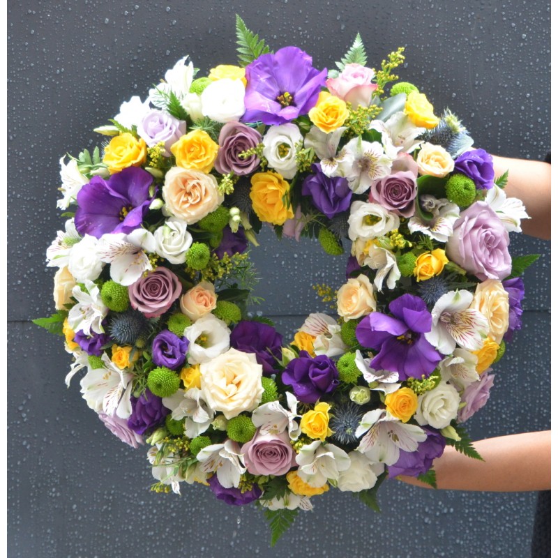 Coronita rotunda realizata pe suport cu burete, diametru aprox 55 cm  contine trandafiri, miniroze, orhidee, eustoma, santini , alstromeria sau alte flori in nuante de mov, alb, galben si verde . Produsul poate fi realizat si in alte nunte coloristice.