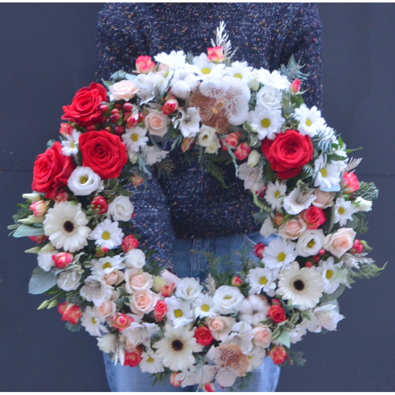 Coronita rotunda realizata pe suport cu burete, diametru aprox 50 cm contine trandafiri, miniroze, orhidee, eustoma, alstromeria sau alte flori in nuante de rosu, alb, si verde . Produsul poate fi realizat si in alte nunte coloristice. Se poate atasa o panglica cu un mesaj ales de dvs,