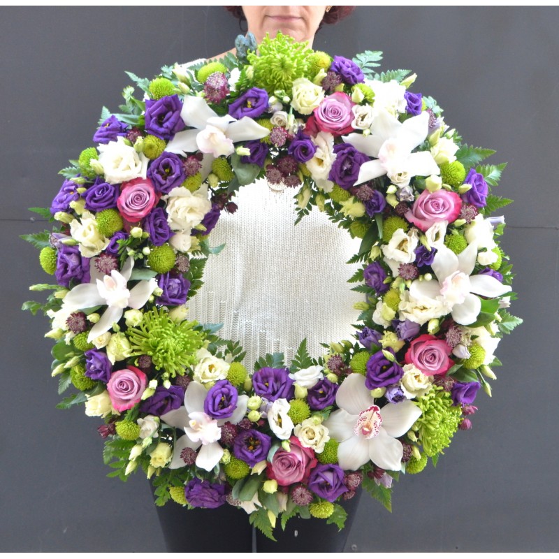 Coroana rotunda realizata pe suport cu burete, diametru aprox 55-60 cm contine trandafiri, orhidee, eustoma, miniroze , crizanteme sau alte flori in nuante de mov, alb si verde . Produsul poate fi realizat si in alte nunte coloristice.