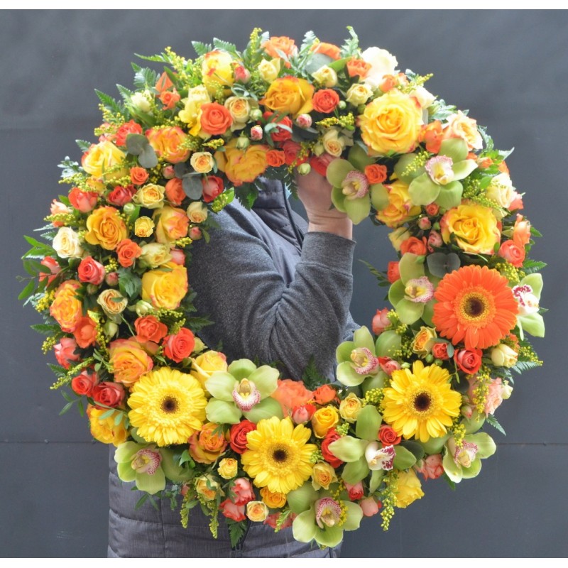 Coroana rotunda realizata pe suport cu burete, diametru ext aprox 60 cm contine 20 trandafiri, miniroze, gerbere, santini si orhidee cymbidium Produsul poate fi realizat si in alte nunte coloristice.