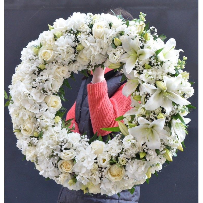 Coroana rotunda realizata pe suport cu burete, diametru exterior aprox 70 cm contine trandafiri, crini, hortensii, eustoma, gypsophila. Produsul poate fi realizat si in alte nunte coloristice.