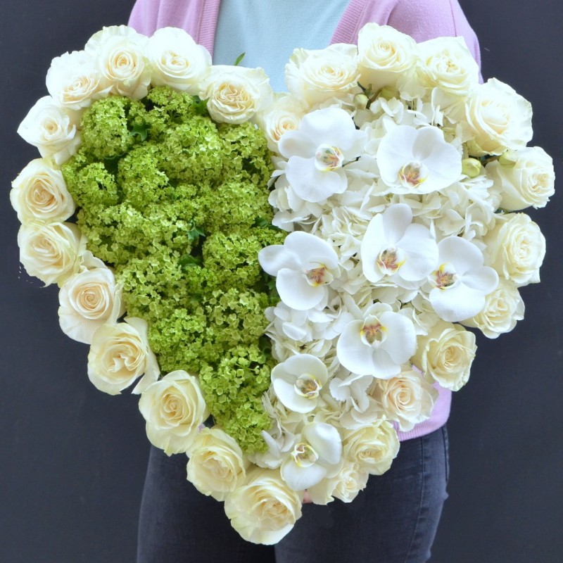 Aranjament in forma de inima realizat pe suport cu burete, diametru aprox 45-50cm  contine 8 orhidee. 24 trandafiri, hortensii (viburnu sau garoafe). Produsul poate fi realizat si in alte nunte coloristice.
