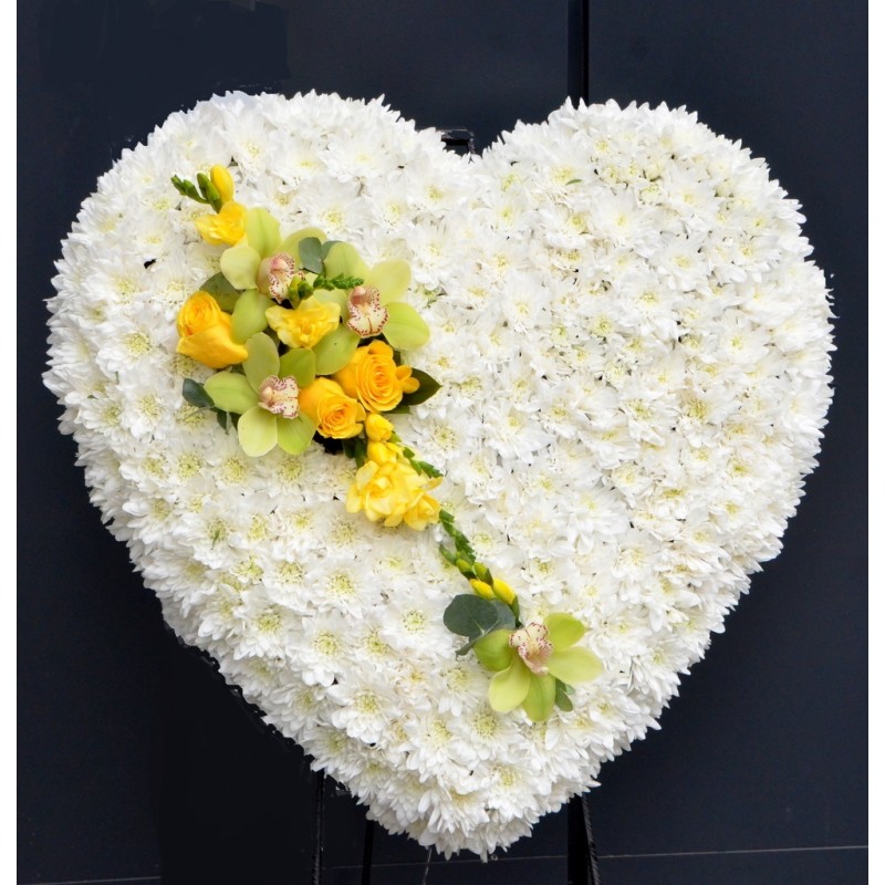 Aranjament in forma de inima realizat pe suport cu burete, diametru aprox 50-60cm  contine crizanteme, orhidee, trandafiri, frezii si verdeata. Produsul poate fi realizat si in alte nunte coloristice.