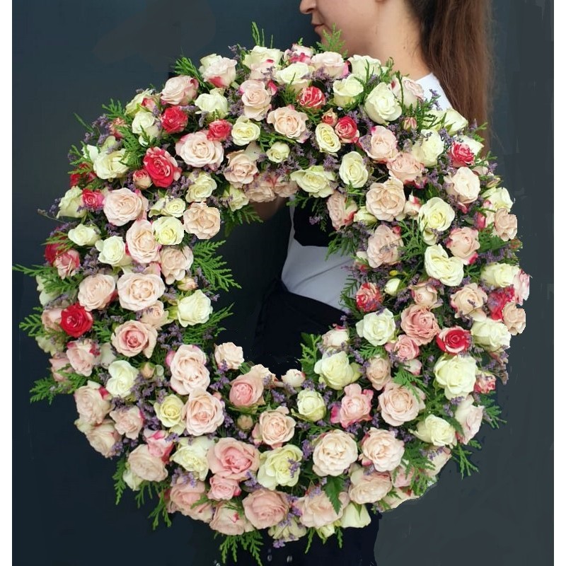 Coroanita rotunda realizata pe suport cu burete, diametru min 50 cm contine miniroze, verdeata. Produsul poate fi realizat si in alte nunte coloristice.
