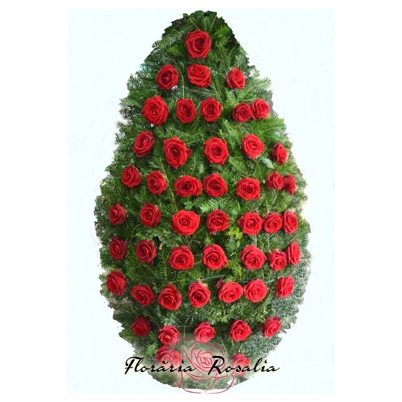 Coroane realizata pe suport de brad cu 50 de trandafiri. La cerere se pot realiza coroane cu un numar diferit de flori si intr-o larga paleta coloristica.