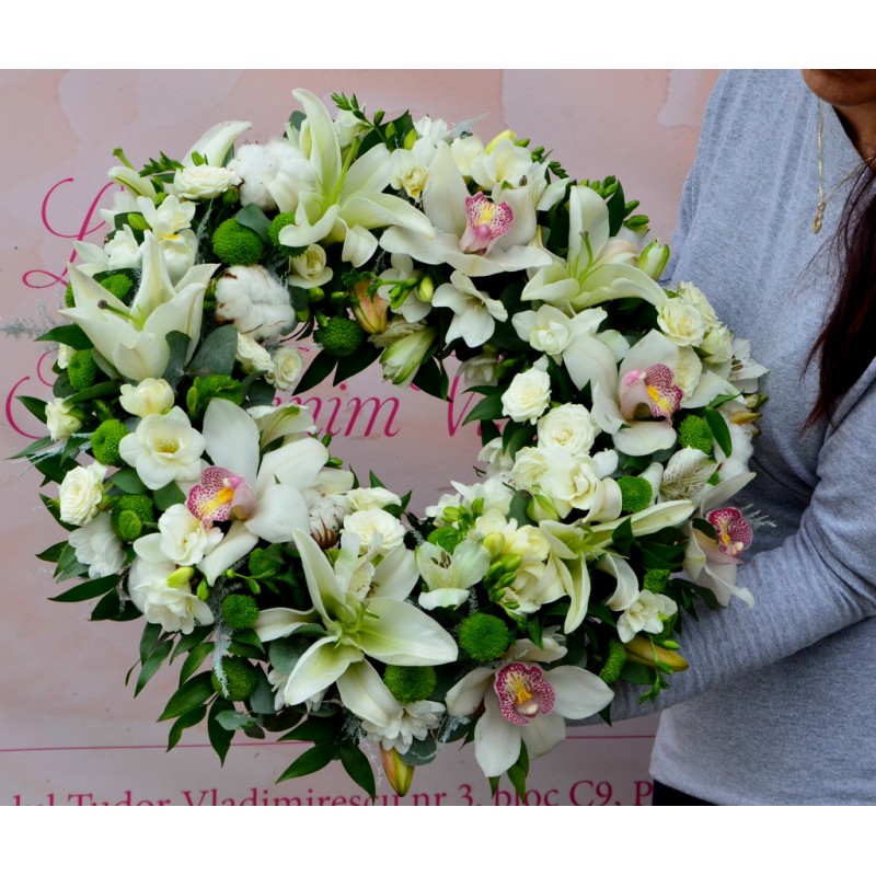 Coroanita rotunda realizata pe suport cu burete, diametru aprox 50 cm contine crini, frezii, orhidee , miniroze, santini, bumbac, verdeata. Produsul poate fi realizat si in alte nunte coloristice.