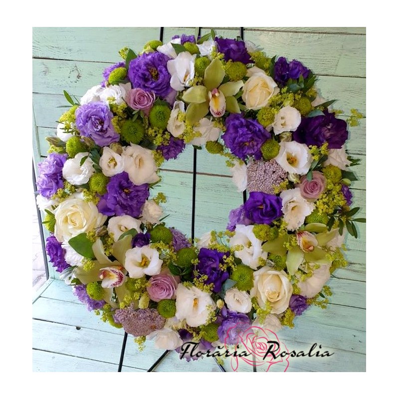 Coroana rotunda realizata pe suport cu burete, diametru aprox 50 cm contine trandafiri, orhidee, eustoma, santini , limonium sau alte flori in nuante de mov, alb si verde . Produsul poate fi realizat si in alte nunte coloristice.