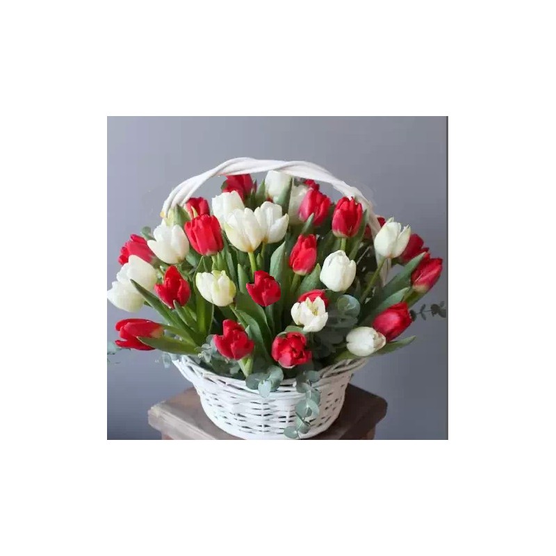 35 lalele albe si rosiii in cos de nuiele.