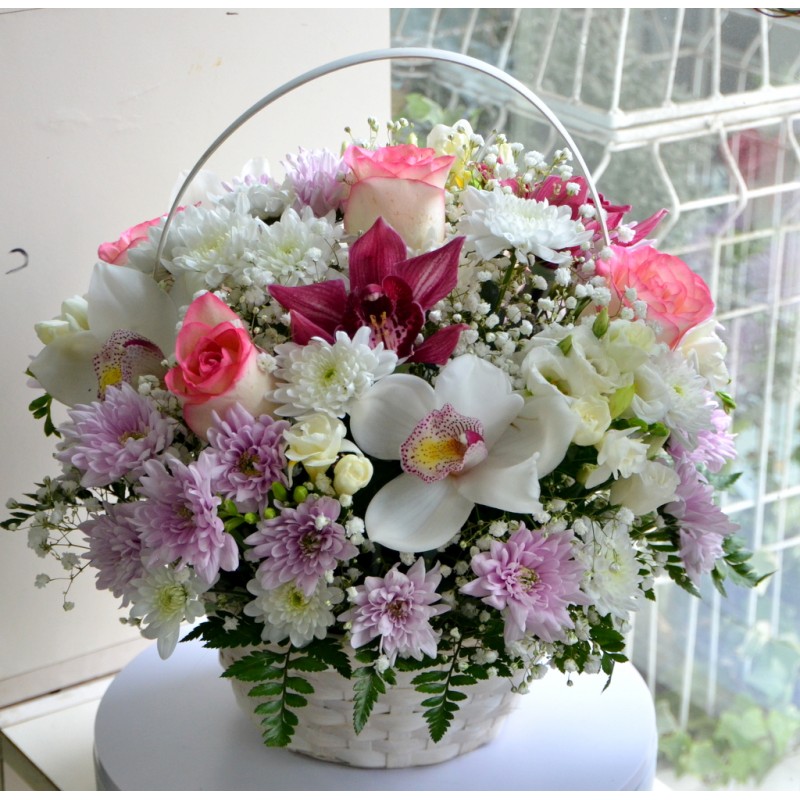 Cos de nuiele cu 21 fire de flori (trandafiri, frezii, orhidee cymbidium, eustoma, crizanteme, gypsophila) si verdeata, toate fixate in burete umed pentru pastrarea prospetimii timp indelungat.