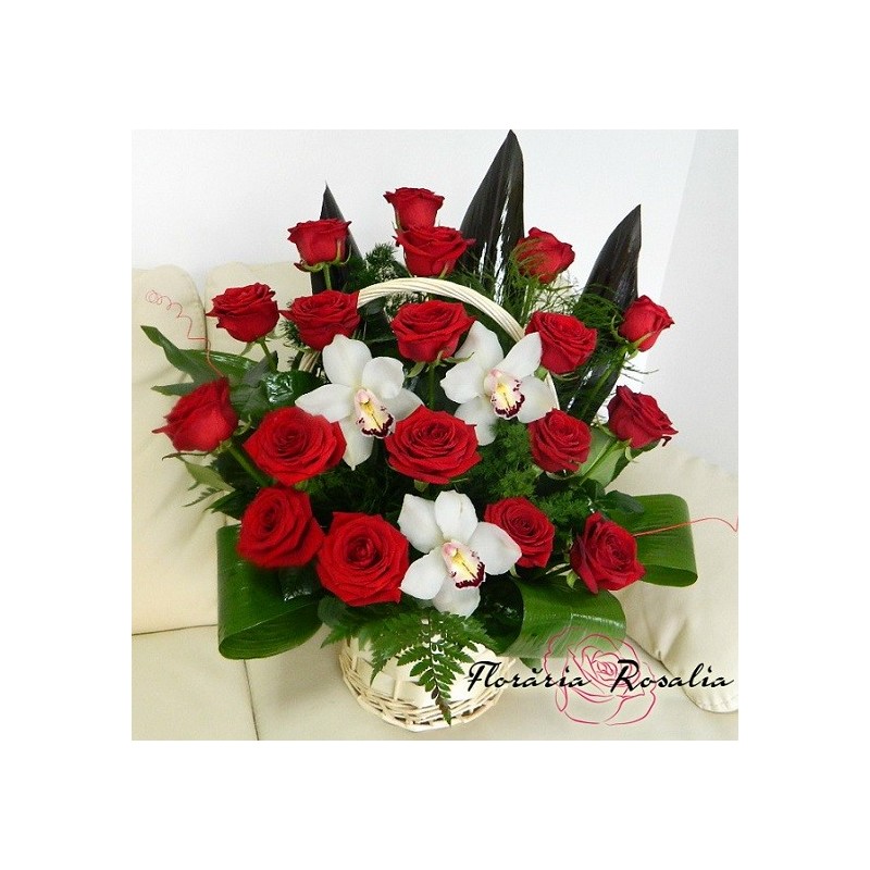 18 trandafiri rosii , 3 cupe orhiidee cymbidium albe in cos de nuiele si burete floral, care confera o usurinta mai mare florilor sa se mentina proaspete.
