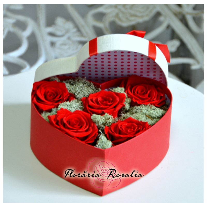 Aranjament cu 5 trandafiri rosii conservati in cutie inima, accesorii