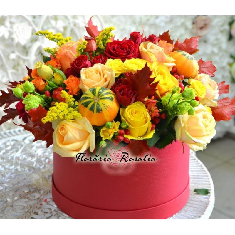 Cutie eleganta rotunda ce contine 9 trandafiri , miniroze, eustoma,solidago frunze de toamna, bostanei, accesorii.