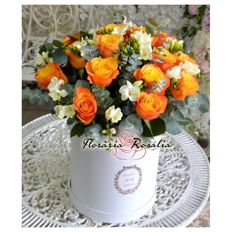 Cutie cu trandafiri portocalii si frezii